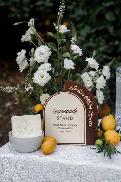 Sarah and Bryan’s wedding at a private estate in San Juan Capistrano, CA, embodied a moody Palm Springs vibe with bold materials and funky shapes. Custom acrylic menus and personalized bar signs added unique touches, creating a stylish yet intimate celebration.